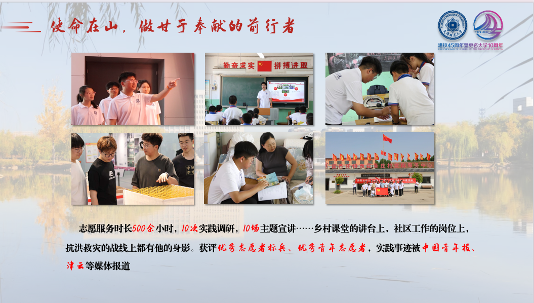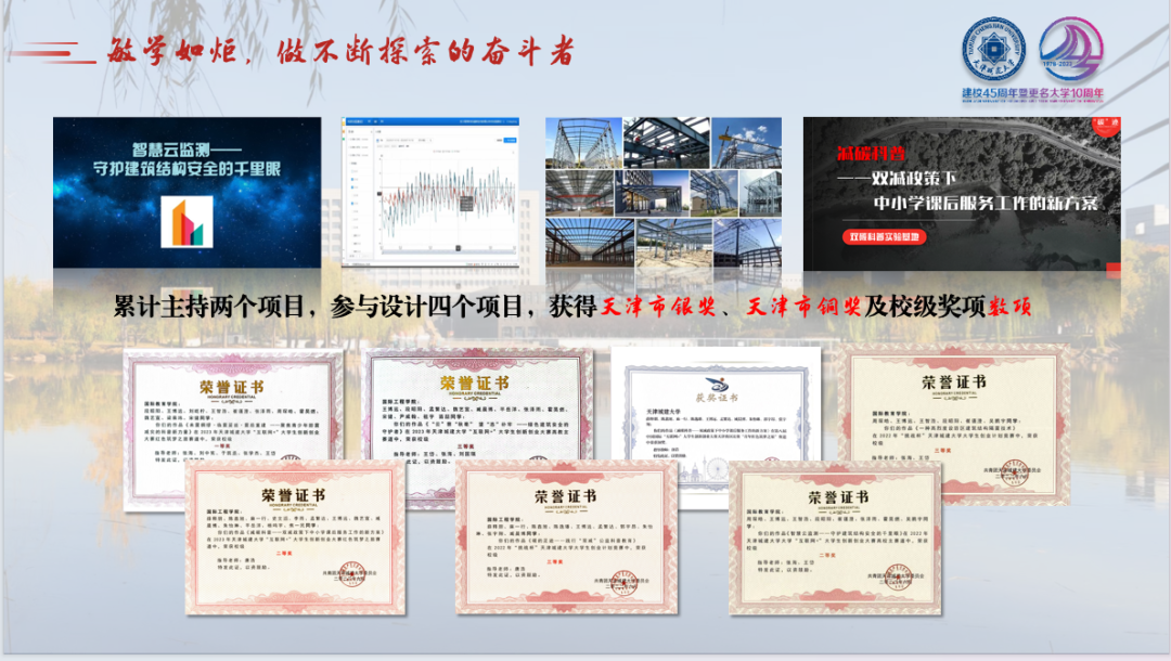 科技引领发展,创新决定未来,他积极投入科创活动,完成国家级老员工创新创业项目一项,以二作身份发表论文两篇,一篇被北大核心期刊录用。设计主持老员工科创项目两项,参与项目四项,获评互联网+天津市银奖、铜奖,校级奖项四项,挑战杯校级奖项三项。