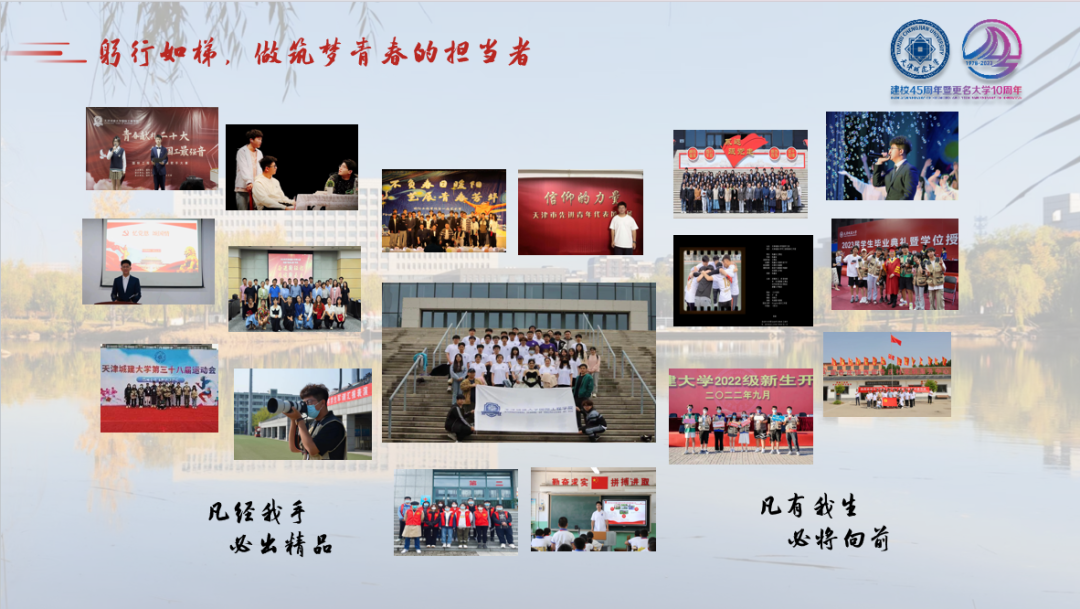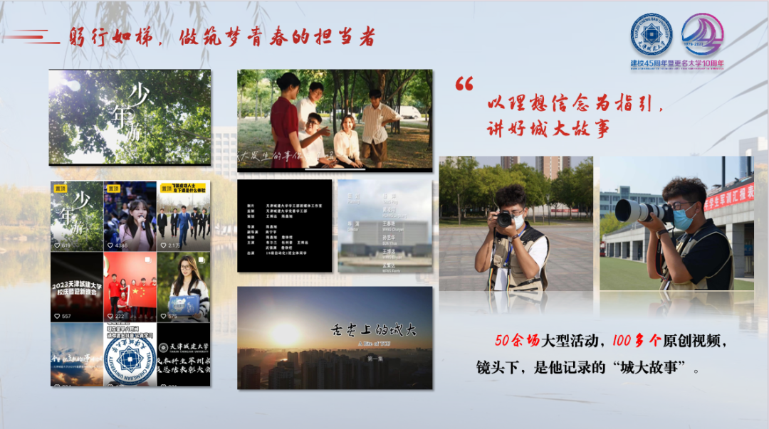 50余场大型活动,100多个原创视频,镜头下,是我记录的“城大故事”。相关作品获评天津市奖项三项,原创优秀视频作品《舌尖上的城大》获评由市教委主办的天津市“我们这十年”优秀网络文化作品三等奖,原创视频被津云、中国青年报等媒体转发,带领部门连续两年获评天津市先进集体。