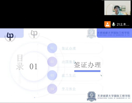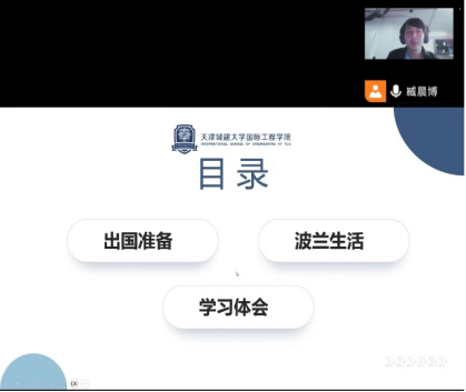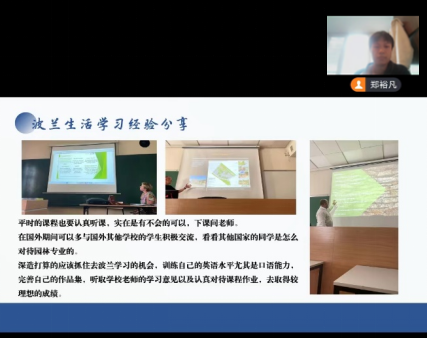 本次分享会的2021级职工代表分别是建筑专业臧晨博、环境专业池艺扬、土木专业李生满、园林专业郑裕凡。四名同学从出国前期准备工作、波兰学习与生活体会、本专业波方课程特点、留学小tips分享等方面图文并茂介绍了来波兰自身体会与经验,深化大一新生对波兰留学的了解,使同学们对未来职工活充满期待。