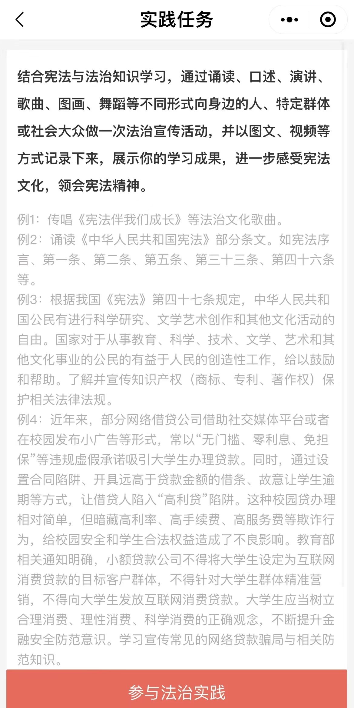 三是”实践任务“模块,同学们可结合宪法与法治知识学习,展示学习成果。