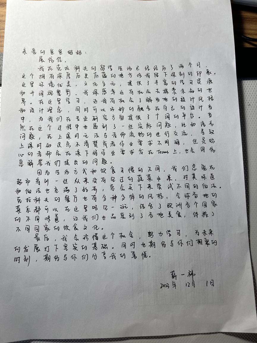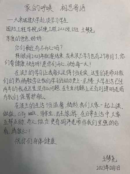 寄上我在波兰的问候。这里的学业进展顺利,生活也在慢慢适应。虽然身处异国,但我始终感受到你们的关爱和支持,这是我在远离家乡时最大的安慰。
