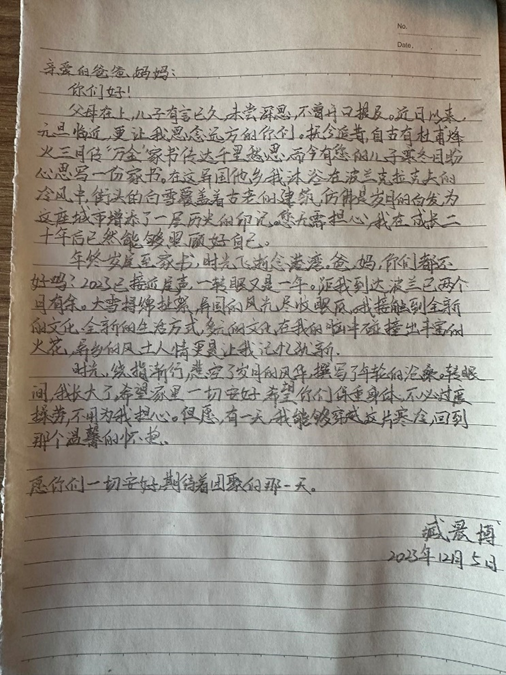 来到波兰已两月有余,对故乡以及亲人的思念已然到达顶峰。伟德BV1946官网在波兰留学的学子,给自己万里外的家人写下了一封封家书。浓浓的愁思、满满的牵挂,想要说出的话,凝结成一封封的家书,借此遥寄相思与祝福。