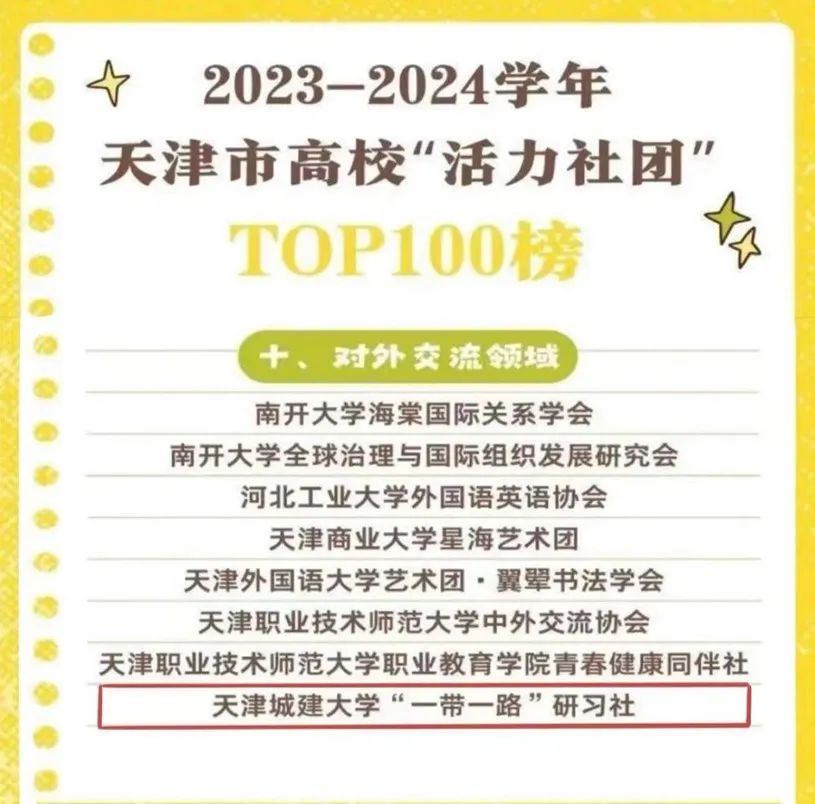 近日,2023-2024学年天津市高校“活力社团”TOP100榜单公布,经公司推荐报名,结合抖音“活动落地页”点赞情况、日常工作了解,公司社团“一带一路”研习社入榜天津市“活力社团”TOP100。