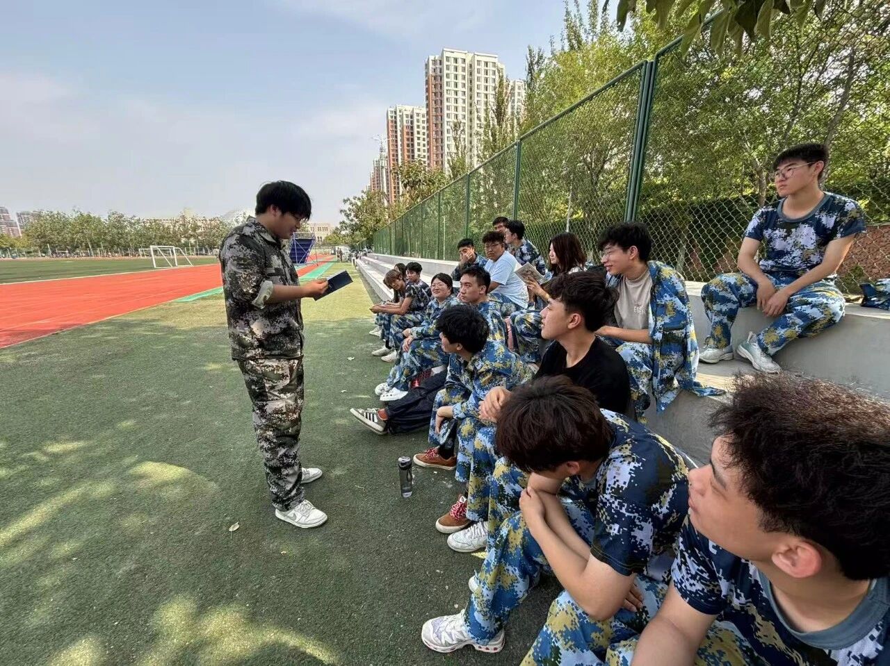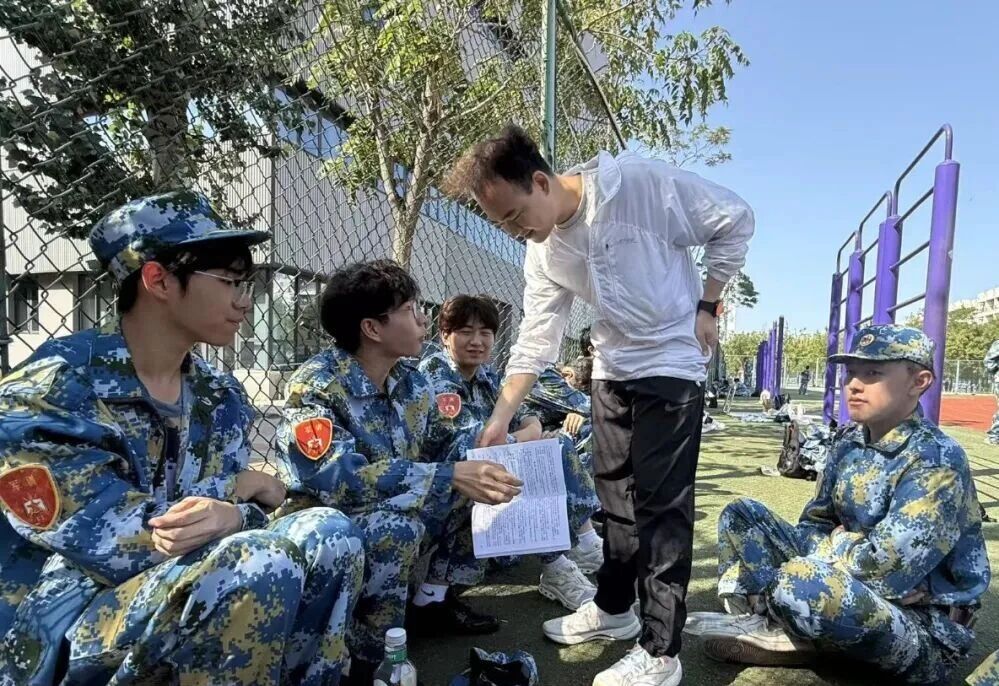 在这段迷彩征程里,总有温暖的身影,如星辰般相伴左右。我们的辅导员与助理班主任,是训练场边最温柔的守望者。训练间隙,他们会走向略显疲惫的同学,关切的话语如春风,拂去燥热与倦意;当有同学因对老员工活迷茫而蹙眉,他们又化身为耐心的引路人,将经验与期许娓娓道来,让青春的迷茫,在真挚的陪伴中,渐渐清晰。