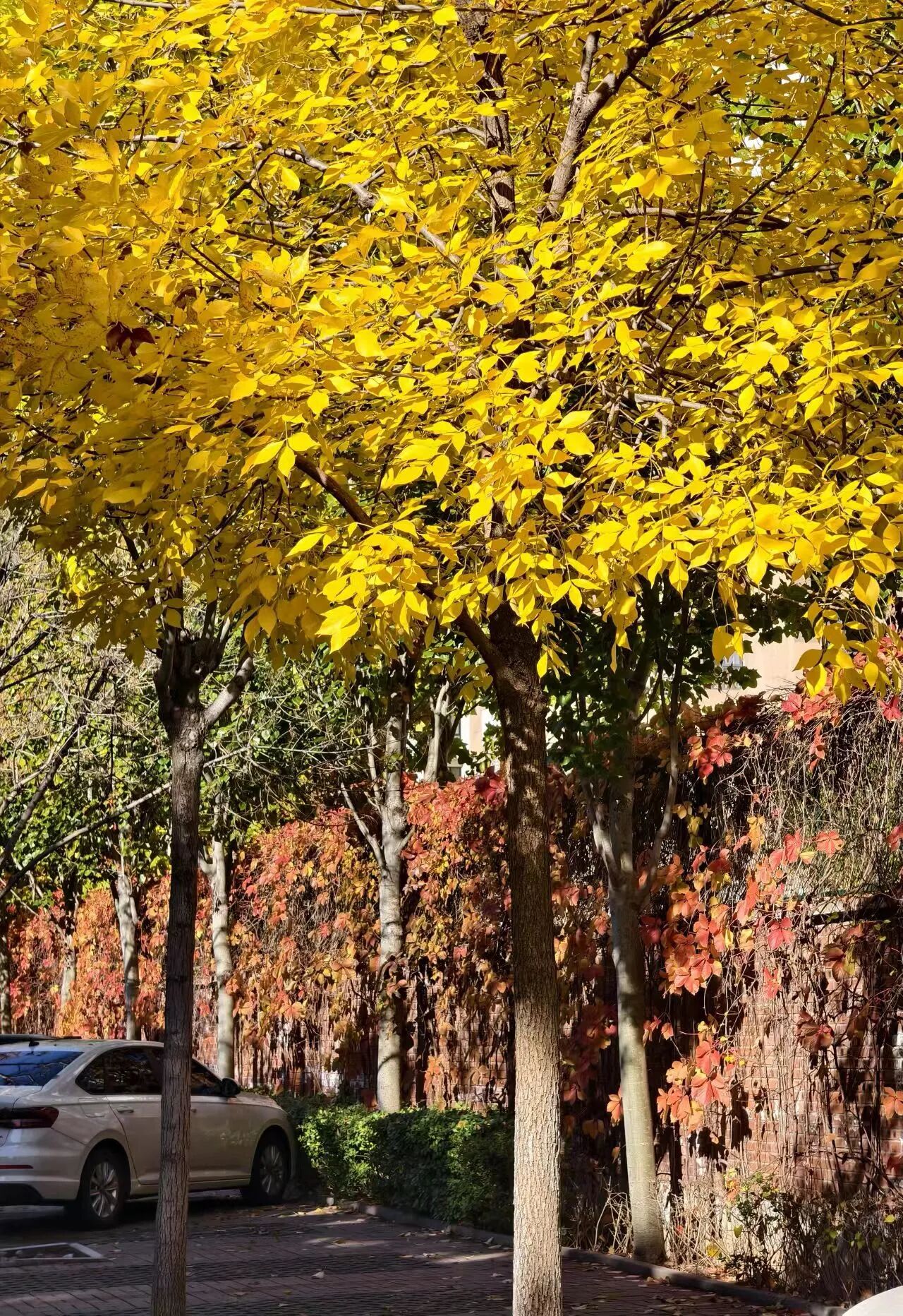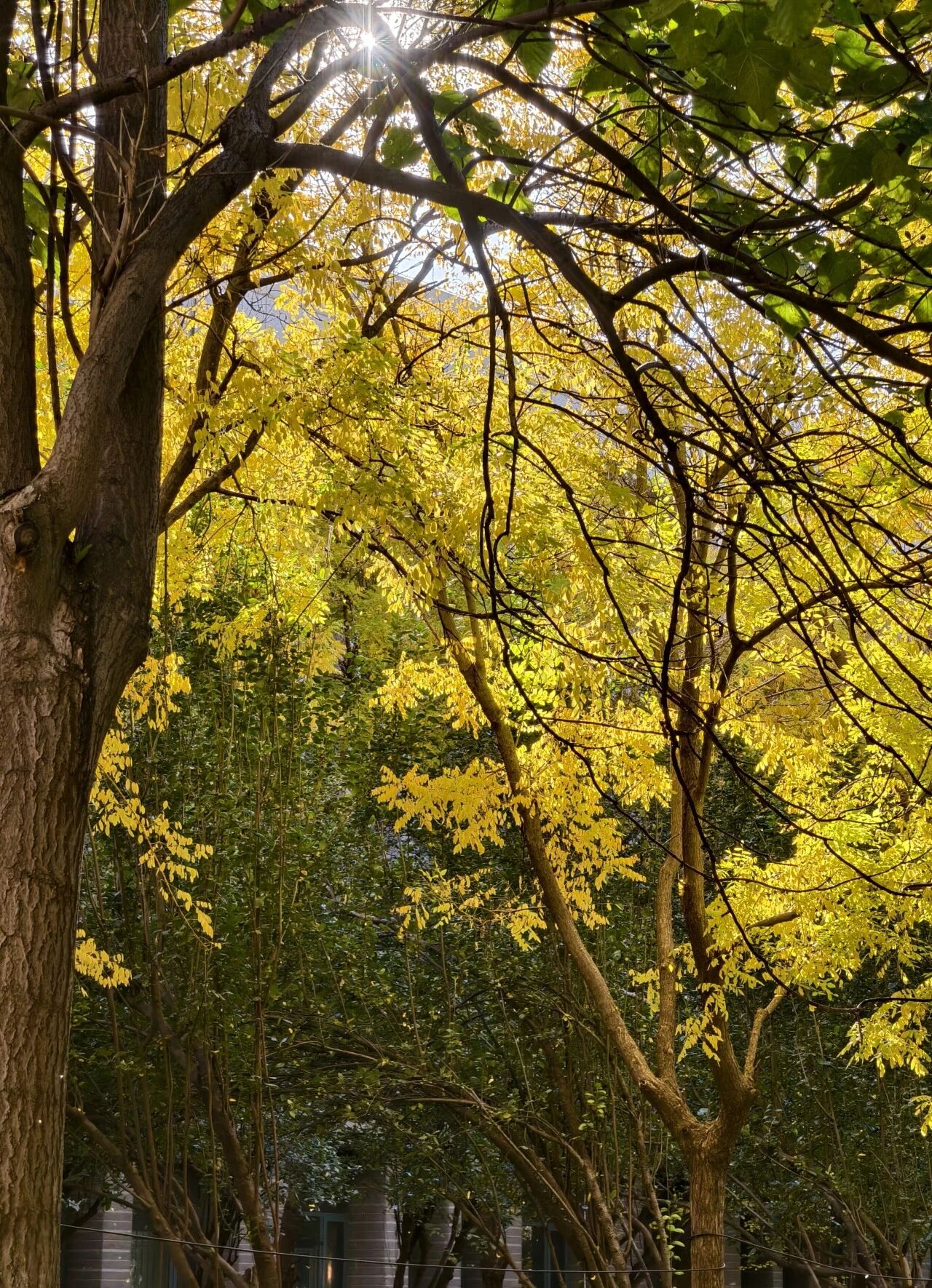 Looking up, the towering trees reveal their sturdy branches and vibrant foliage against the azure sky. Some leaves glowed golden, others retained traces of green, while still others had turned crimson. This rich tapestry of hues formed a three-dimensional autumn tableau. These trees stood as guardians of the campus, bearing witness to the rhythmic cadence of study within the teaching blocks and the youthful exuberance unfolding upon the sports fields.