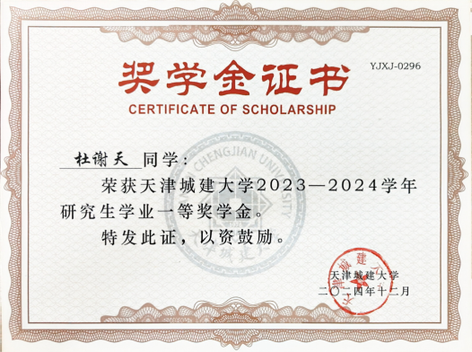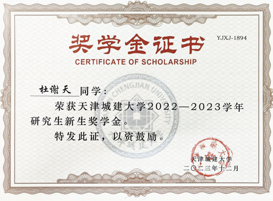 一次国家奖学金、连续两年荣获校级一等学业奖学金,一次校级优秀研究生,交通运输部天津水运科学研究院海洋水动力研究中心优秀实习生。