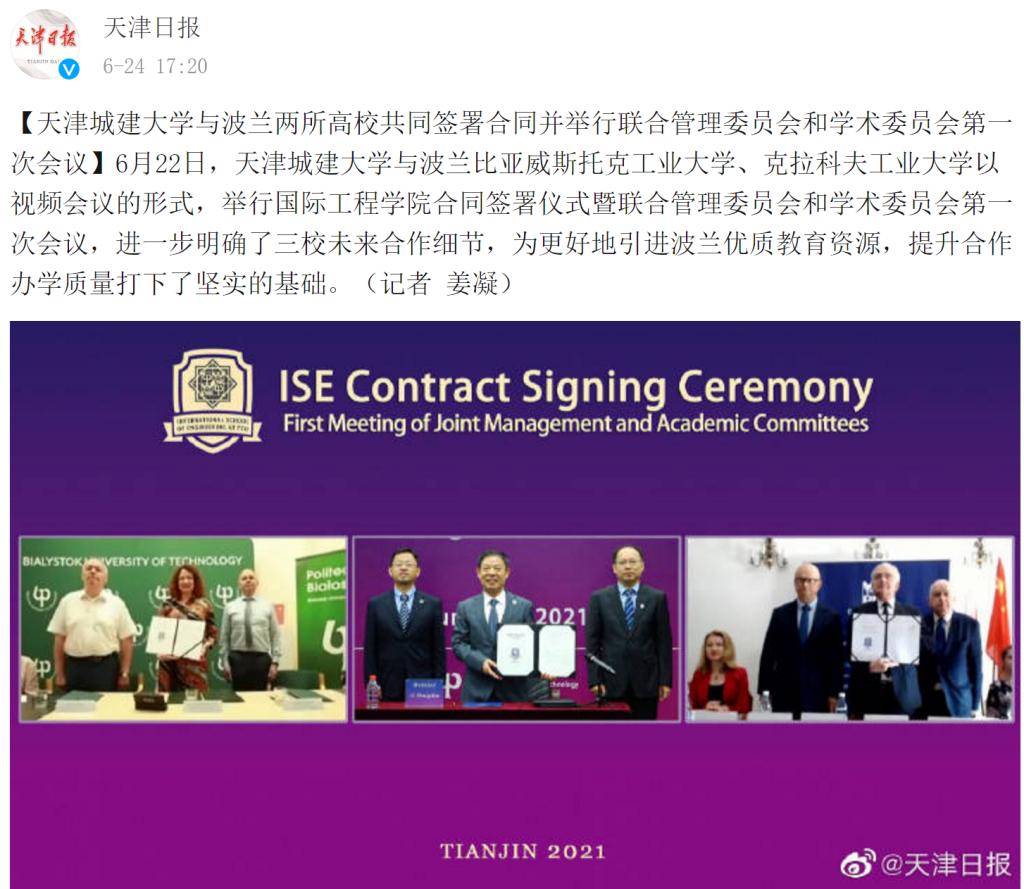6月24日,天津日报微博对公司与波兰两所高校共同签署合同并举行联合管理委员会和学术委员会第一次会议进行了如下报道: