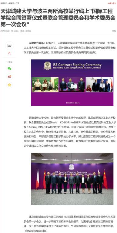 6月24日,天津北方网对公司与波兰两所高校举行线上“伟德BV1946官网合同签署仪式暨联合管理委员会和学术委员会第一次会议”做了如下报道: