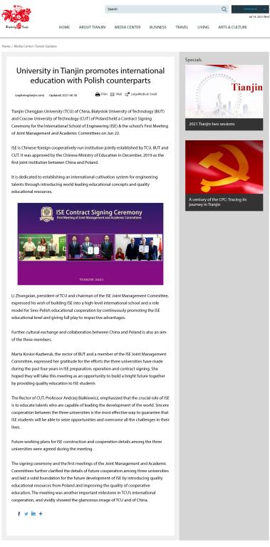 Tianjin Chengjian University (TCU) of China, Bialystok University of Technology (BUT) and Cracow University of Technology (CUT) of Poland held a Contract Signing Ceremony for the International School of Engineering (ISE) & the school’s First Meeting of Joint Management and Academic Committees on Jun 22.