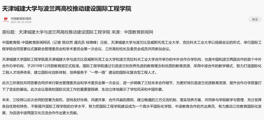 6月25日,中国教育新闻网对公司与波兰两所高校共同签署合同并举行联合管理委员会和学术委员会第一次会议进行如下报道:
