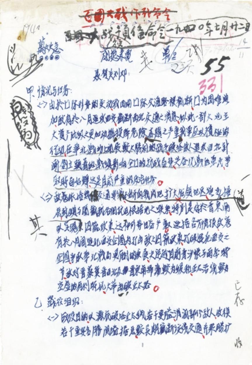 1940年8月8日,《朱德、彭德怀、左权关于破击正太路的战役部署》(中央档案馆 藏)