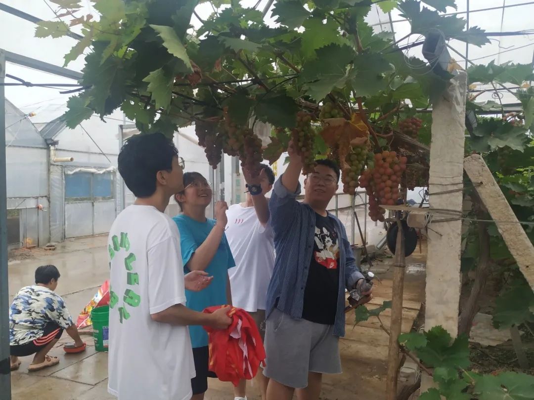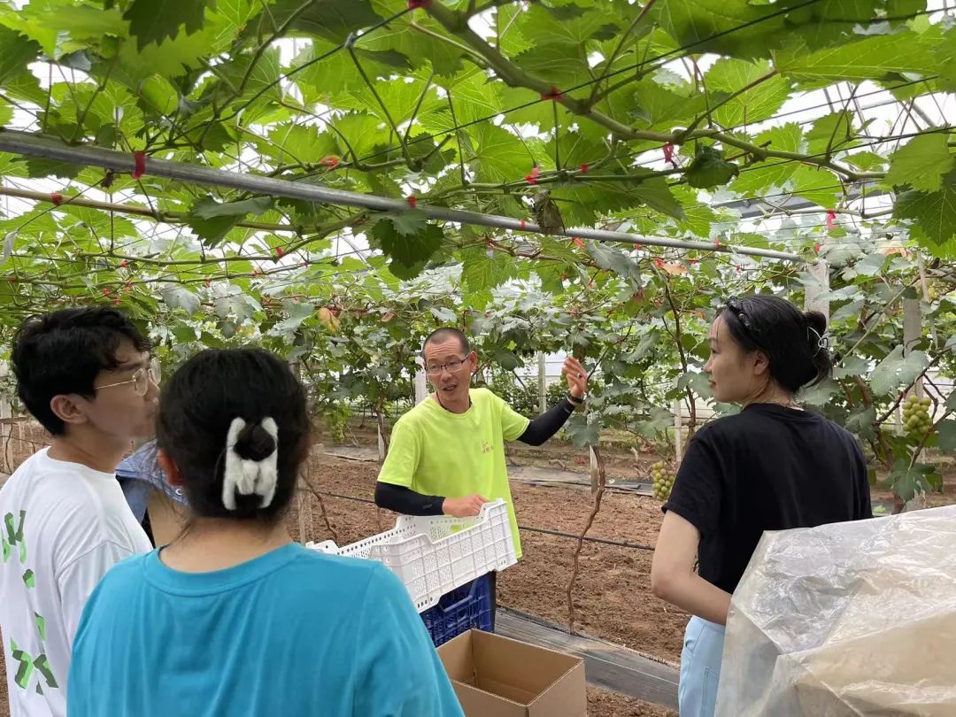 随后师生一众来到了葡萄大棚,丁家瞿阝村的葡萄远近闻名,在习总书记提出了希望天津加快发展现代都市型农业的指示后,丁家瞿阝村闻令而动,根据当地的用地环境和土壤情况,引进了不同品种的优质葡萄苗,在村“两委”的带领下,村民建设200多亩大棚,发展棚栽葡萄,并成立了专业合作社,同学们在葡萄大棚中与果农进行了深入的交流,了解农产品的选种育苗栽培等工作,纷纷表示这一串串普通的葡萄,原来凝结了这么多农民和农技人员的心血,对于农业工作有了一个崭新的认识。