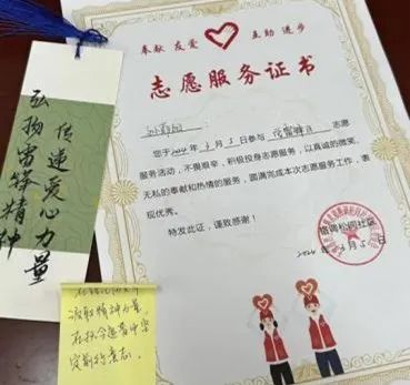为了让雷锋精神得到更好的传承,同学们将精心制作的书签赠与社区人员,以此表达对雷锋精神的敬意。同时,社区人员回赠了七色光志愿服务队的证书,以表达感谢。