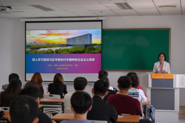 国际工程公司党总支书记杨萍围绕习近平新时代中国特色社会主义思想、党纪学习教育、习近平总书记与天津、习近平总书记寄语青年四个方面讲授了《深入学习贯彻习近平新时代中国特色社会主义思想》专题党课,她强调,同学们要深入学习贯彻习近平新时代中国特色社会主义思想和习近平总书记视察天津重要讲话精神,把学习《中国共产党纪律处分条例》作为重要政治任务,准确掌握其主旨要义和规定要求,进一步明确日常言行的衡量标尺,用党规党纪校正思想和行动,真正使学习党纪的过程成为增强纪律意识、提高党性修养的过程,做到自觉学纪、准确知纪、心中明纪、言行守纪。