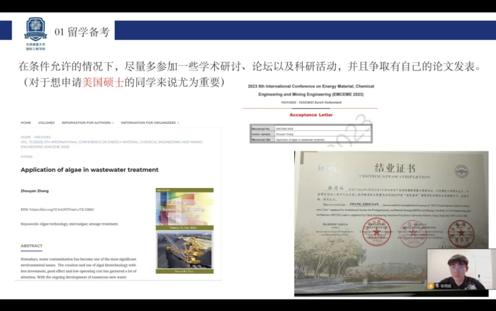 活动开始,由2020届环境工程专业优秀毕业生员工张周延开展线上宣讲。张周延目前在宾夕法尼亚大学攻读环境专业硕士学位,通过视频连线与大家分享了留学申请的策略与技巧。他强调了提前规划出国留学的重要性,建议同学们在申请前要明确了解目标院校和专业的录取要求,制定个性化的申请计划。同时,张周延用中英分享了自己在美国的学习和生活体验、留学申请过程中遇到的挑战和克服方法,包括如何平衡学业和生活、参与校园活动等,在同学们提供了宝贵的参考。