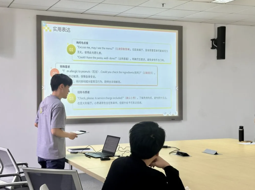 Expression: Tong Kai (Class of 2023, Civil Engineering) presented "Essential English Phrases and Etiquette for Studying Abroad," covering useful words and sentences for daily communication, academics, and social interactions. He encouraged students to practice speaking and engage with locals. And he shared practical English phrases and expression, such as language skills in real-life scenarios like shopping, dining, and academic discussions.