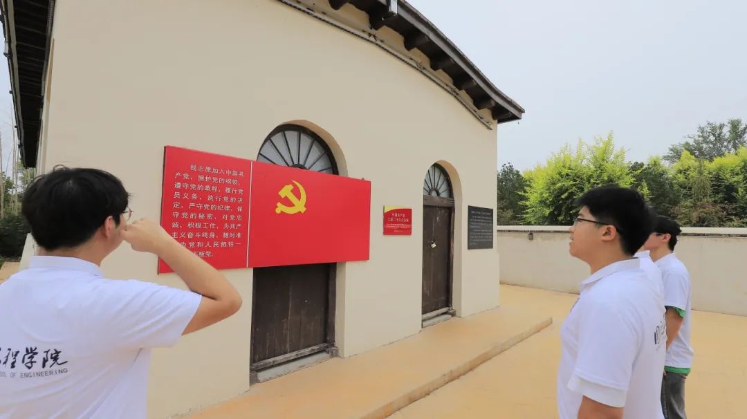 实践团赴黄儿营西村“新时代教育基地”,身临其境地接受革命传统教育。“新时代教育实践基地”主要由“十里党建大道”“村史馆”“农村森林”等三个展示部分组成,包括场景还原、图片展示、实物展览等形式。实践团成员在讲解员的带领下,回顾中国共产党团结带领中国人民不懈奋斗的光辉历程,深入领会党的优良传统、优良作风和伟大精神的深刻内涵。参观后,实践团党员以昂扬的姿态和饱满的热情面向鲜红的党旗庄严宣誓,以铿锵有力的誓言表达对党的忠诚和为人民服务的决心。