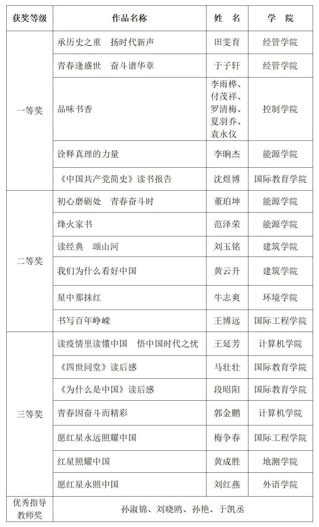 组委会根据校内各二级公司读书节系列活动宣传推动情况、报送数量、作品水平评选出优秀组织奖8个,名单如下:经济与管理公司、能源与安全工程公司、计算机与信息工程公司、建筑公司、伟德BV1946官网、国际教育公司、外国语公司、控制与机械工程公司。