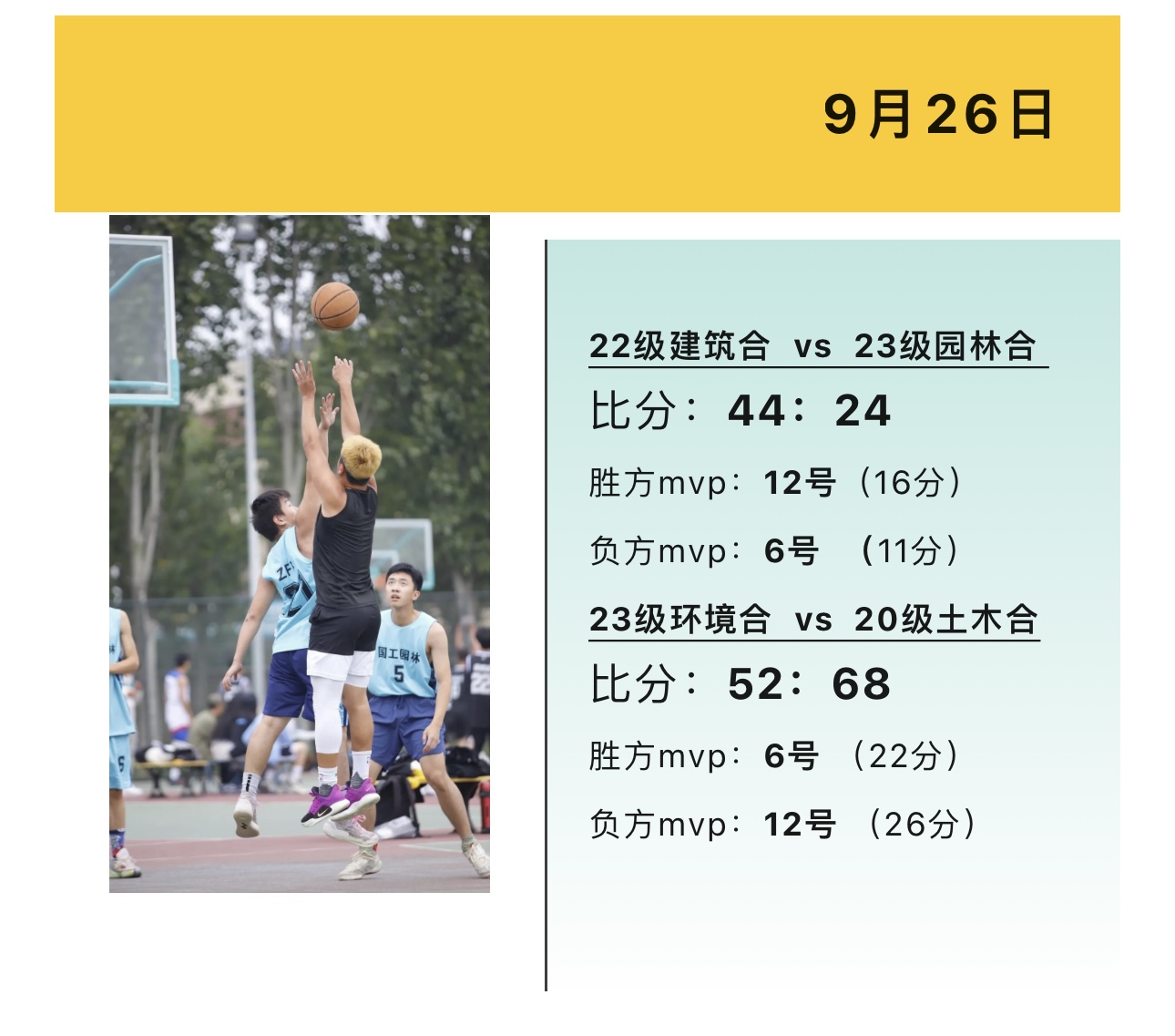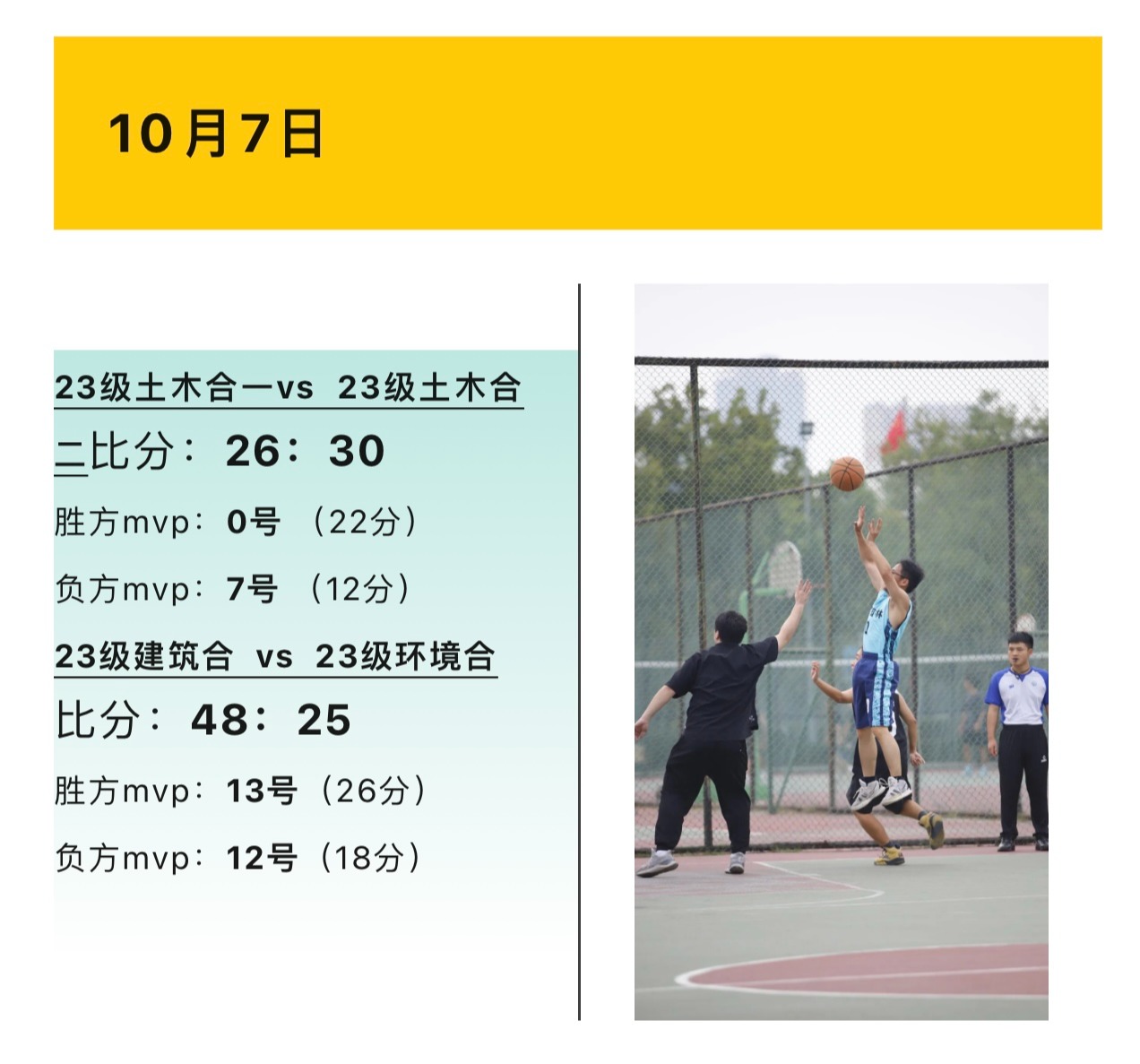 比赛中青春的热情与篮球场上的激情相逢,碰撞出梦想奋进的火花,球员们的步伐未曾停歇,汗如雨下的他们仍坚守赛场,在9月26日和10月7日两天的激烈竞逐中,赛况如下: